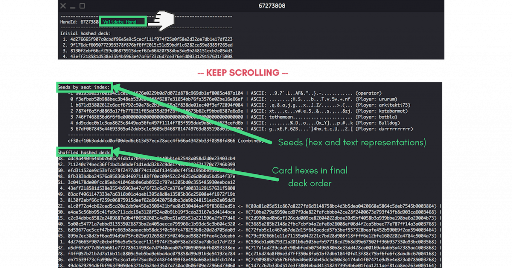After the hand is played, players receive the real seeds of all participants, which they can use to verify their participation in the final deck shuffle, as well as the randomness of the cards.