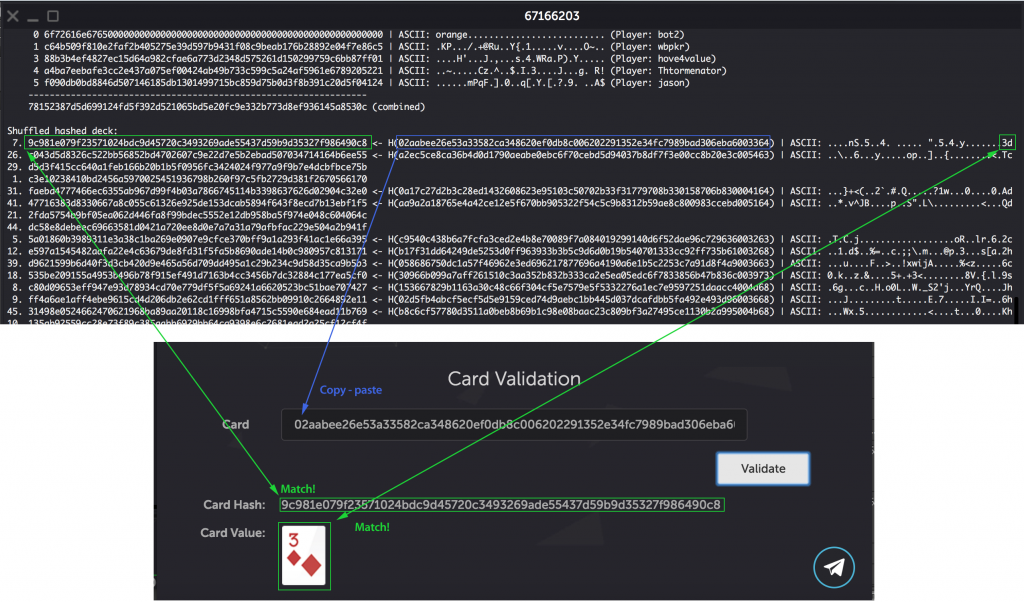 Choose one of the dealt cards (these will have both a hash on the left and the encrypted hash function on the right. Enter the hash inside the function of the right in the Card Validation section. The output should be the hash listed to the left in CoinPoker, as well as the correct card value.