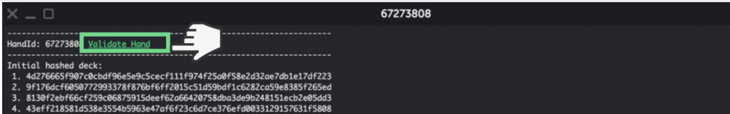 Proving participation is just the start. Players can also verify the randomness of the cards in the final deck. This can be done for all community cards and hands revealed by other players (so no Mucked hands), but for the sake of explaining we will show you how you can verify the fairness of the first two cards:
