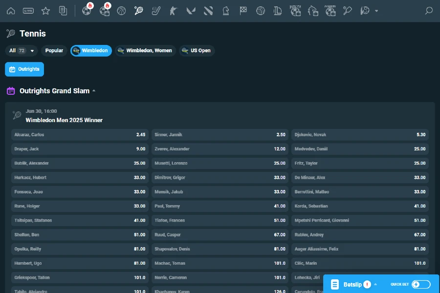 Carlos Alcaraz and Jannik Sinner are two names that jump off the page. The pair are neck and neck at the top of the outright market, priced around +150, showing how close this year could be. Alcaraz dominated the “Wimbledon warm-up” tournament at Queen’s Club, sweeping aside all before him. His blend of power and touch makes him a serious threat to Sinner on grass.