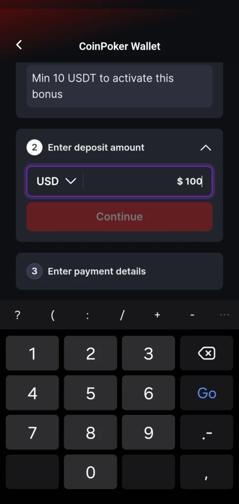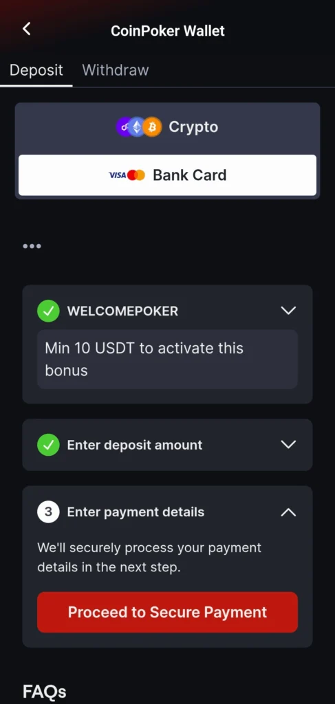 With your bank card deposit complete, those funds are available for use on any of the games on CoinPoker. You can always check your balance in the Wallet section of the app, and make withdrawals or deposits freely.