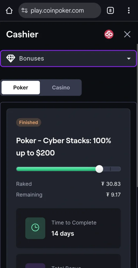 If you want to see whether your CoinPoker bonus is active or check your current progress, this guide shows you how you can on both mobile and desktop.