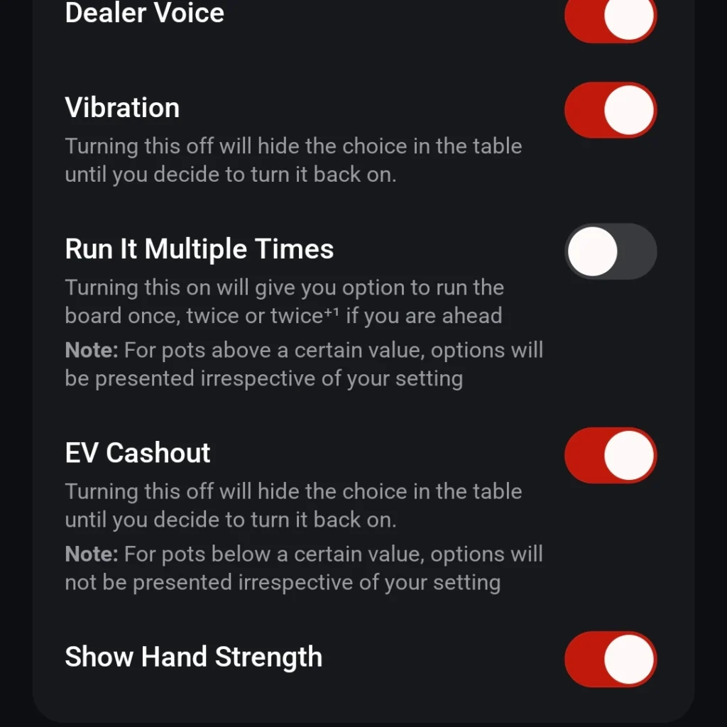 Turn your EV Cashout on or off. When it is on, EV Cashout will be offered whenever an eligible all-in happens.