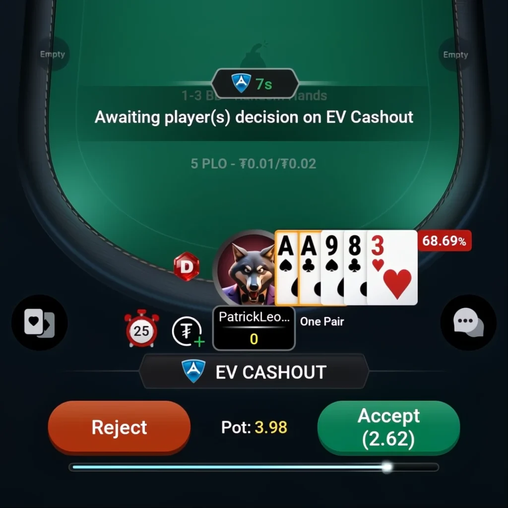 • Stay protected against potential bad beats: You can opt for EV Cashout to safeguard your share against rare, inevitable situations of bad beats.