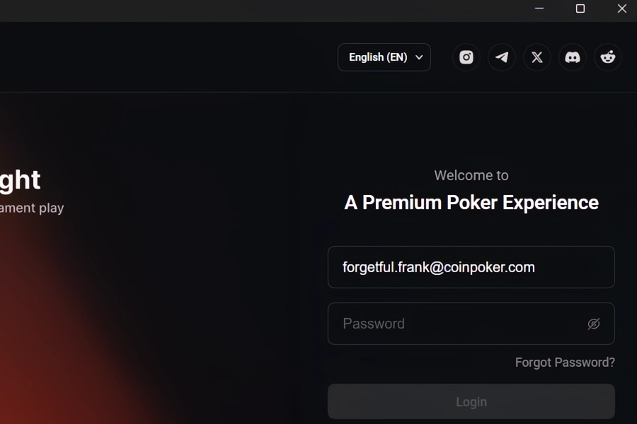 After you open the CoinPoker app, click on “Forgot Password?” above the Login button. This is the same on mobile devices and computers.