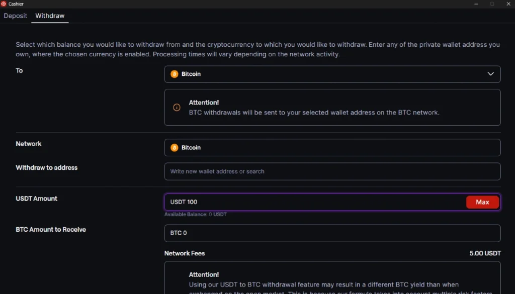 Choose the cryptocurrency you want to use for your withdrawal. We accept USDT, USDC, and BTC withdrawals.