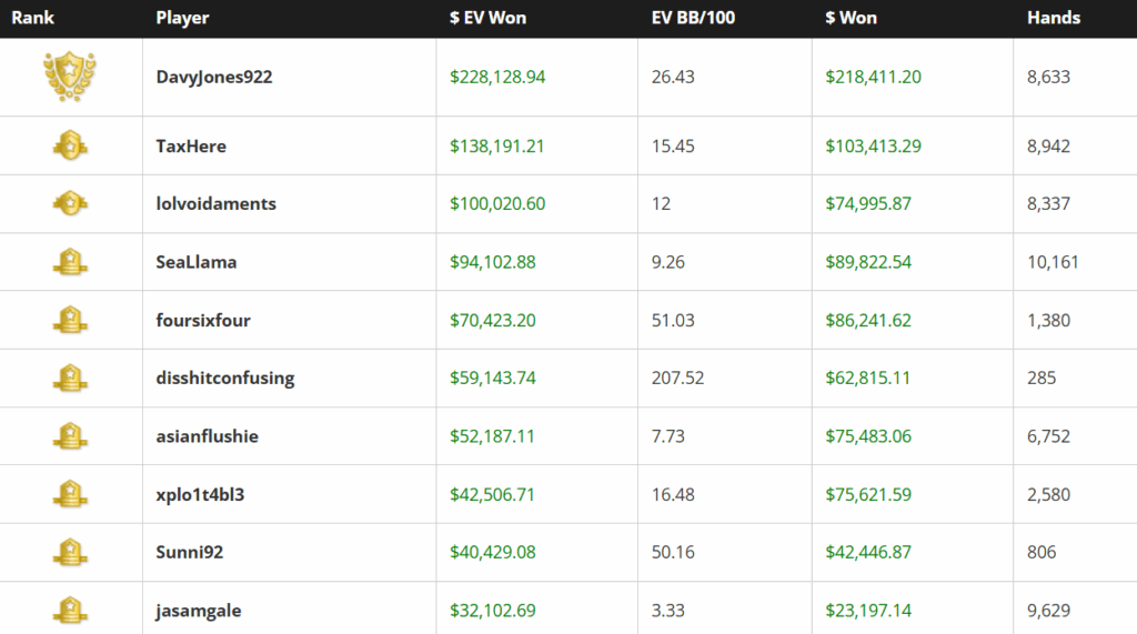 Surprisingly, cash game legend LLinusLLove sits at the bottom, down $186K in $ EV and running $55K under EV. But with his exceptional skills, we’re expecting a strong comeback.