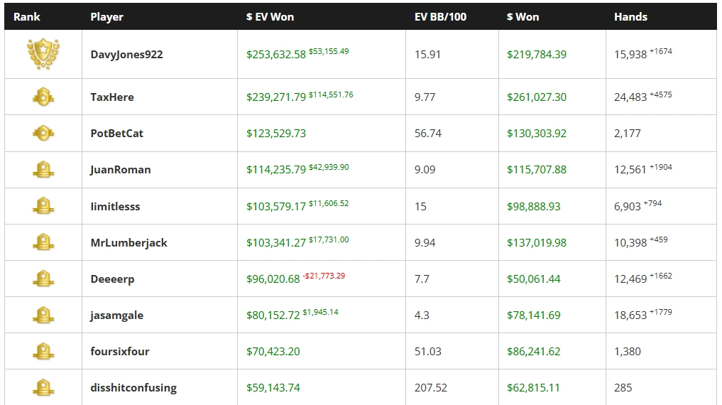 He sits firmly in first place with $253,632 $ EV Won, but the competition is relentless. Taxhere is right on his heels in second with $239,271, refusing to let him pull away. PotBetCat holds third place with $123,529 in $ EV Won.