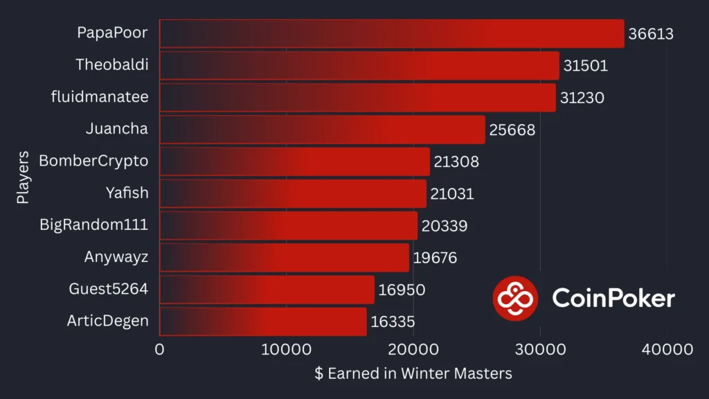The largest field so far was in the $150 CoinMasters BITCOIN, with a whopping 1,161 entries and a $150,000 prize pool. PapaPoor won $25,811 for first place. He’s also near the top of the Winter Masters Leaderboard, looking at a potential top prize of $15,000.