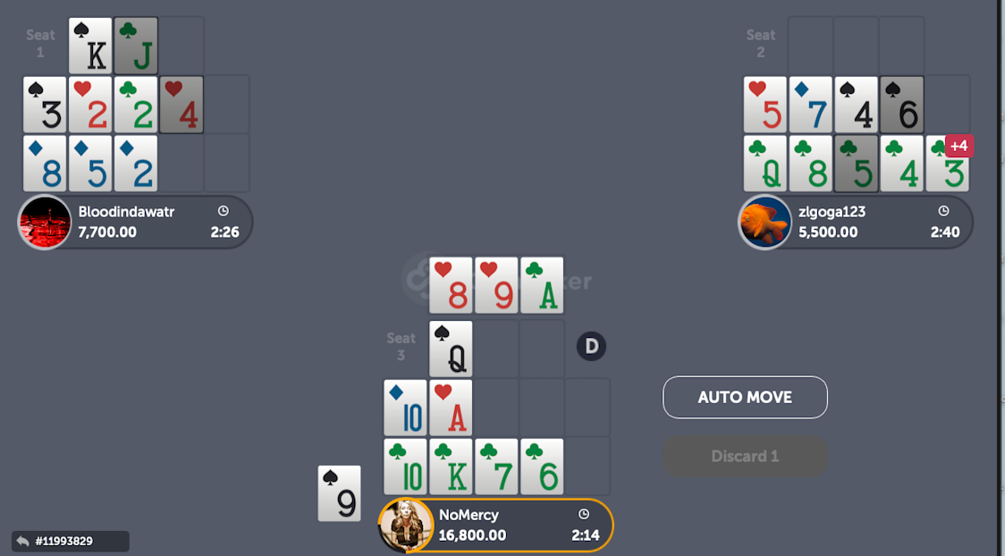 At this point and with two Kings and two Queens still in the deck, we want to keep our top line open and beat at least one of our opponents in the middle with two pairs Aces and 10s. Since there is only one Ace live in this deck, it wouldn’t probably be the best play here to place the 10 in the middle and the Ace on top. Keep in mind however that this Ace could get you to win the top lines, which should be a non-negligible aspect of your decision.