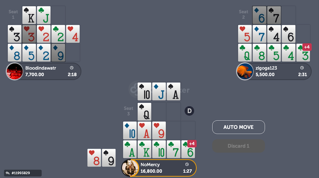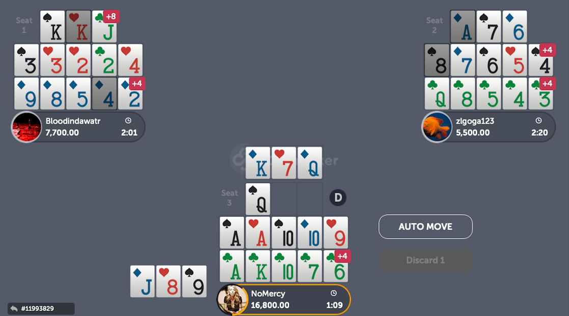 The first option here is the classic way to go: Flush in the back, Aces in the middle, Queens on top. This would be an automatic placement if the Queens were all live. But as you can observe in one of our opponent’s board, the Queen of club is now dead, which leaves us with only 2 Queens to access Fantasyland. Moreover, it will be really difficult to access it with a pair of Kings, since only 2 Kings are still live.