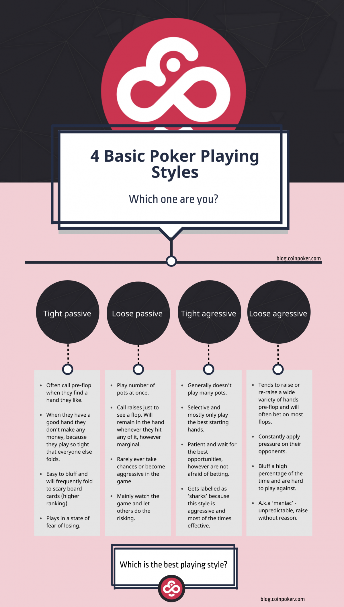 StrategyIf you are somewhat new to a poker game you might have heard phrases such as ‘tight passive’, ‘tight aggressive’, ‘loose passive’, ‘loose aggressive’. Also, words that sound less formal like ‘nit poker’, LAG poker, the ‘bomb’, ‘maniac’ or ‘shark’ and wondered what they mean. Some of them might not sound cohesive, but actually, these all are used to describe someone’s poker playing styles. In this post we will cover the 4 main poker playing styles and shortly discuss why identifying them is important. There’s also an infographic included, which you can use as a cheat sheet or send it to a friend who needs to know things. Let’s get on with it!